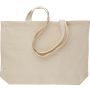 Oeko-Tex minősítésű, 140 g/m2 pamutból készült natúr színű bevásárlótáska, 48 × 34 × 10 cm méretben, 70 cm hosszúságú és 2,5 cm szélességű fülekkel. Oeko-Tex címkével ellátva.
