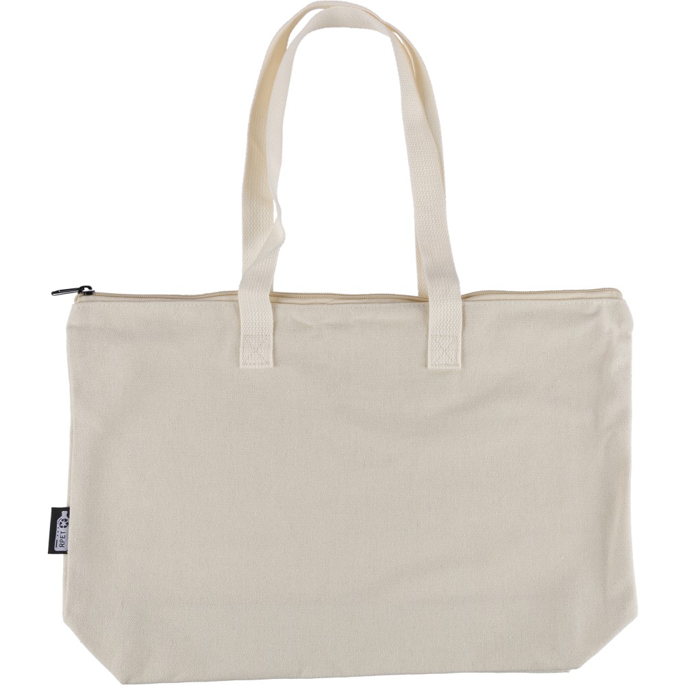 Újrahasznosított pamut-poliészter, 330 g/m2 kevertszövetből készült bevásárlótáska nagy, cipzáras felső rekesszel, 65 cm hosszúságú és 2,5 cm szélességű hosszú fülekkel, a táska színével harmonizáló hevederrel. Külső felületén rPET címkével, belső részén további címkével ellátva.