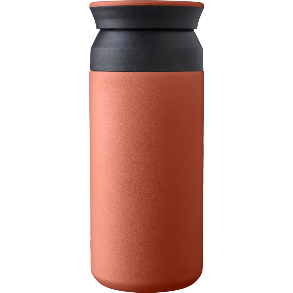Duplafalú vákuumos bögre lapos PP fedéllel. Matt lakkozott. A belső rész 304-es rozsdamentes acélból, a külső rész 201-es rozsdamentes acélból készült. Könnyen nyitható PP mechanizmussal. A tartalmát 12 órán át melegen és 18 órán át hidegen tartja. Egyenként barna karton ajándékdobozba csomagolva. Űrtartalom: 350 ml. Emblémázás: Gravírozás