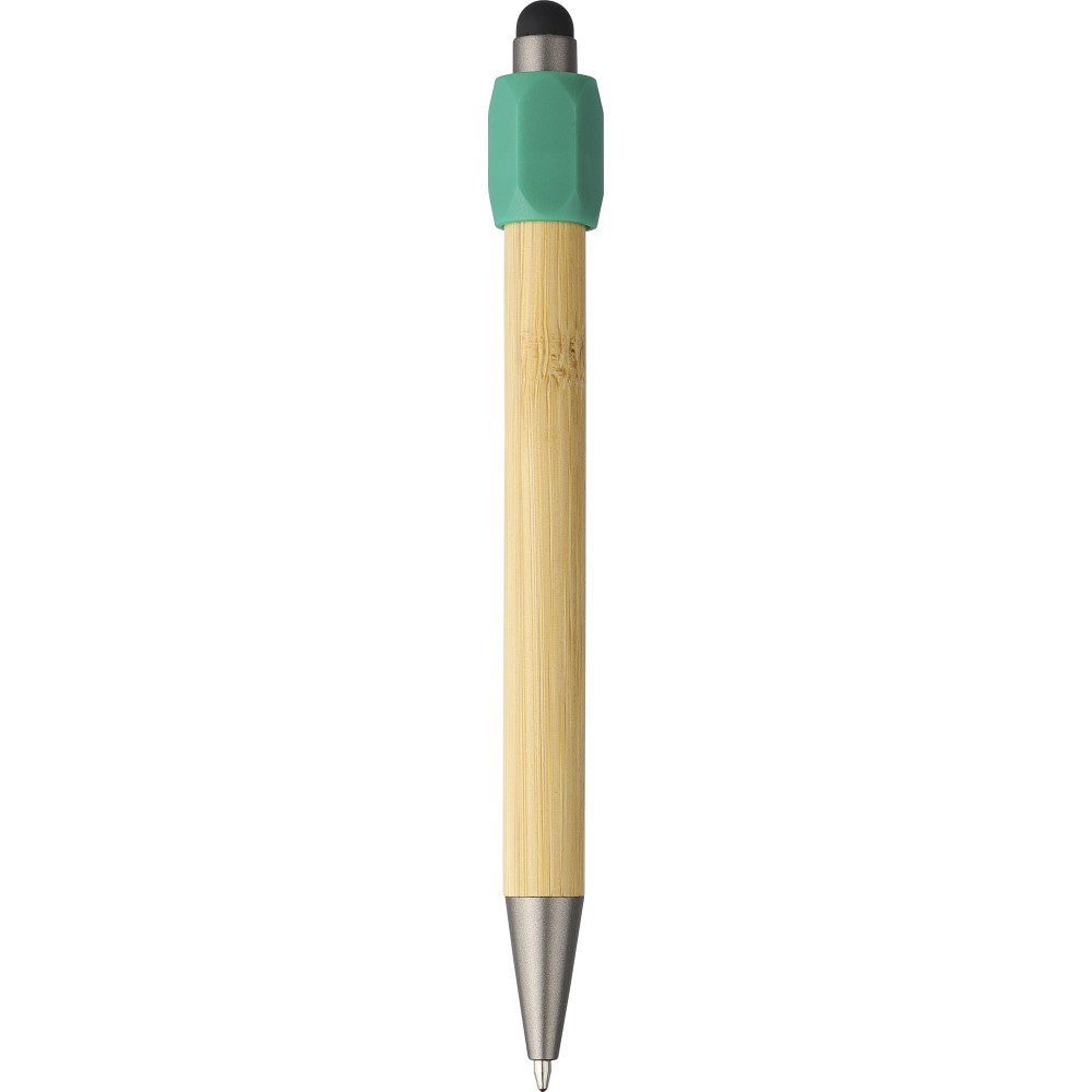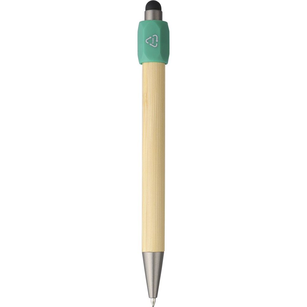 Bambusz golyóstoll újrahasznosított ABS pörgettyűvel és fekete érintővel a nyombógombon. A tollhegy vastagsága 1.0 mm, íráshossz: kb. 800 méter. Az újrahasznosított anyagra utaló logó a tollra van gravírozva. Emblémázás: Gravírozás, Tamponnyomás