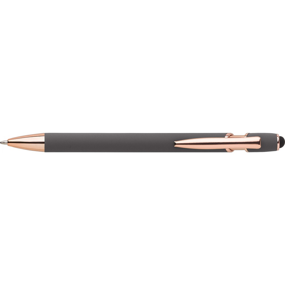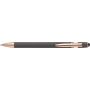 Alumínium golyóstoll rózsaarany részletekkel és érintővel, kék tollbetéttel. Emblémázás: Gravírozás, UV nyomtatás
