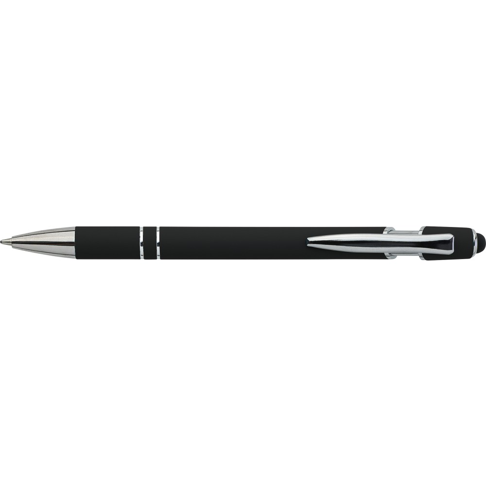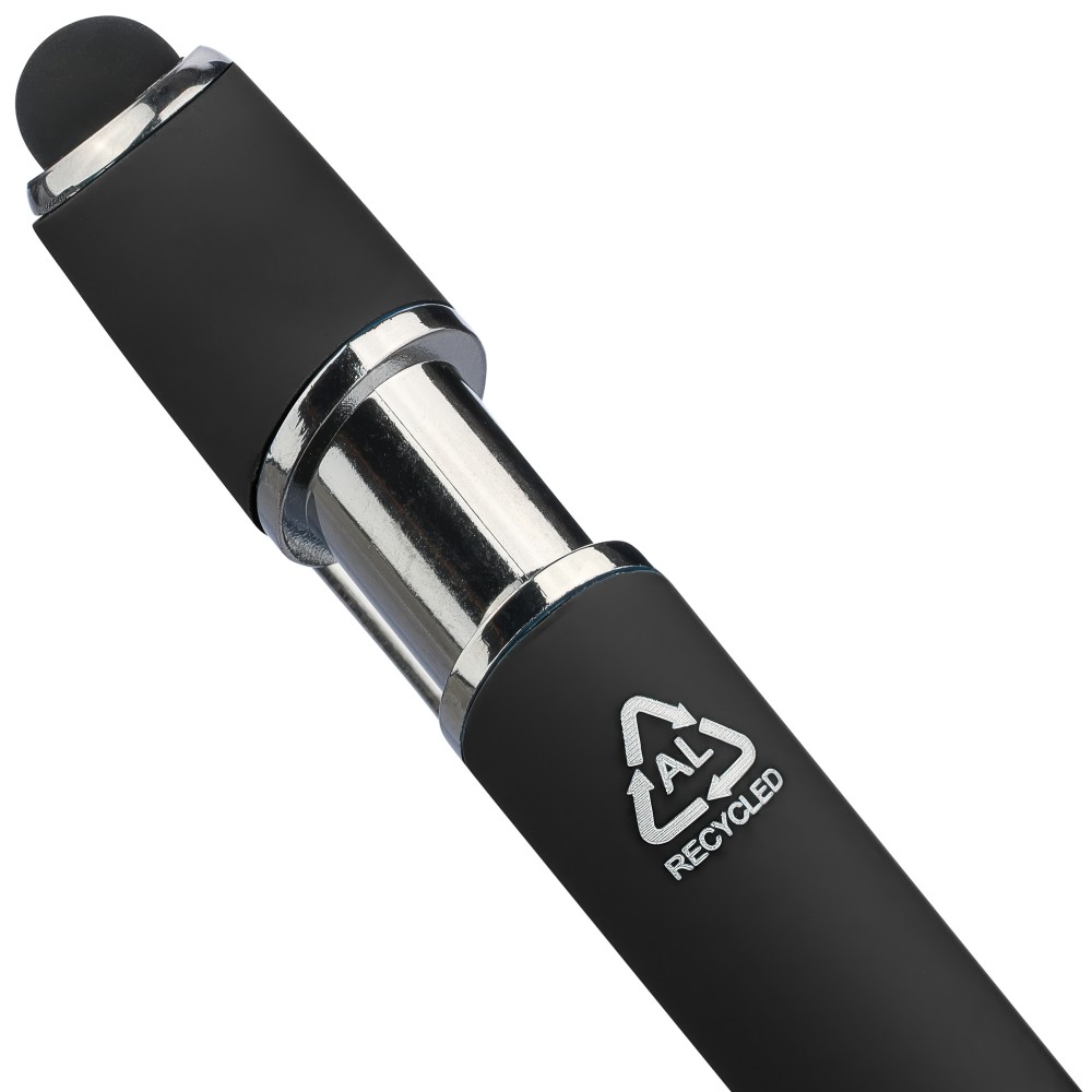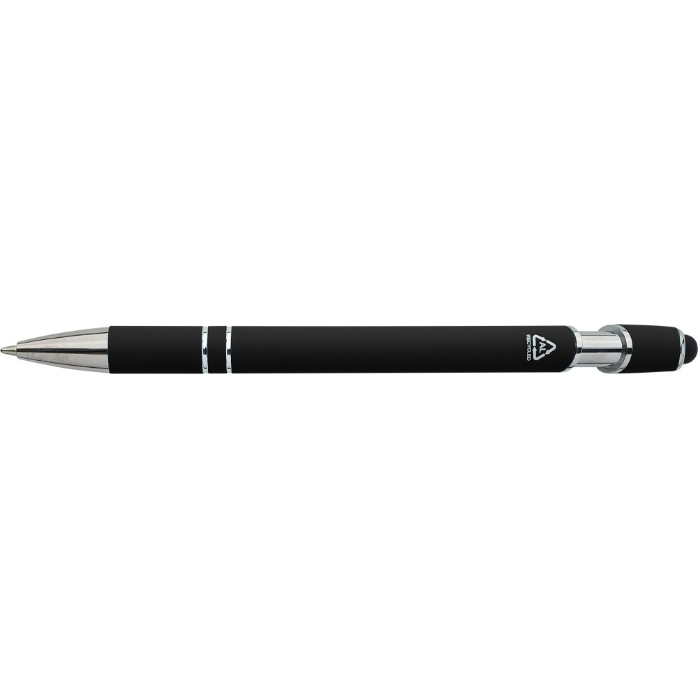Újrahasznosított alumínium golyóstoll egyszínű, gumírozott felületű testtel és fekete, kapacitív érintőképernyőkhöz használható stylus véggel. Ezüstszínű kiegészítőkkel, nyomógombos szerkezettel és fekete tollbetéttel tervezve. A tolltesten gravírozott újrahasznosított logó található.