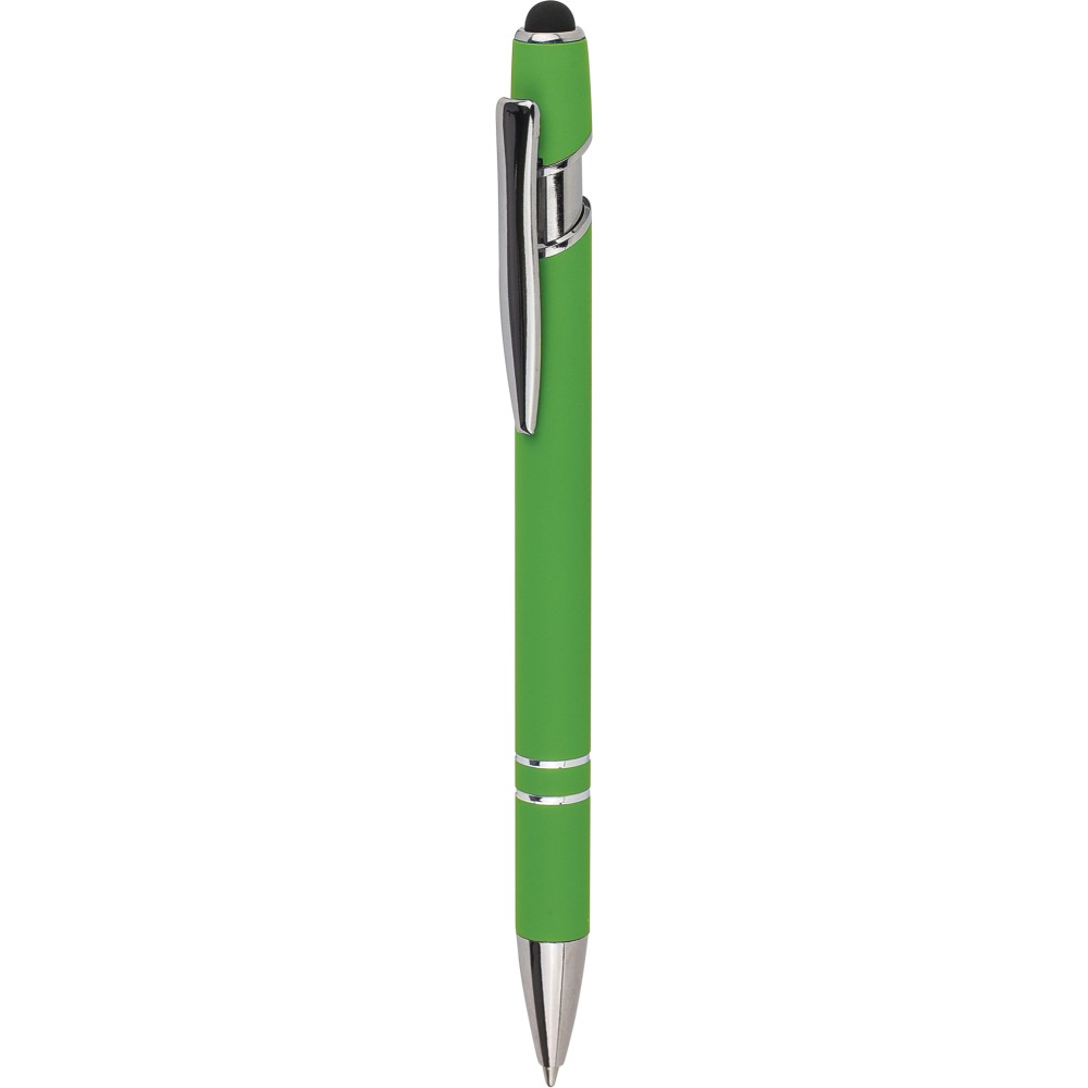Újrahasznosított alumínium golyóstoll egyszínű, gumírozott felületű testtel és fekete, kapacitív érintőképernyőkhöz használható stylus véggel. Ezüstszínű kiegészítőkkel, nyomógombos szerkezettel és fekete tollbetéttel tervezve. A tolltesten gravírozott újrahasznosított logó található.