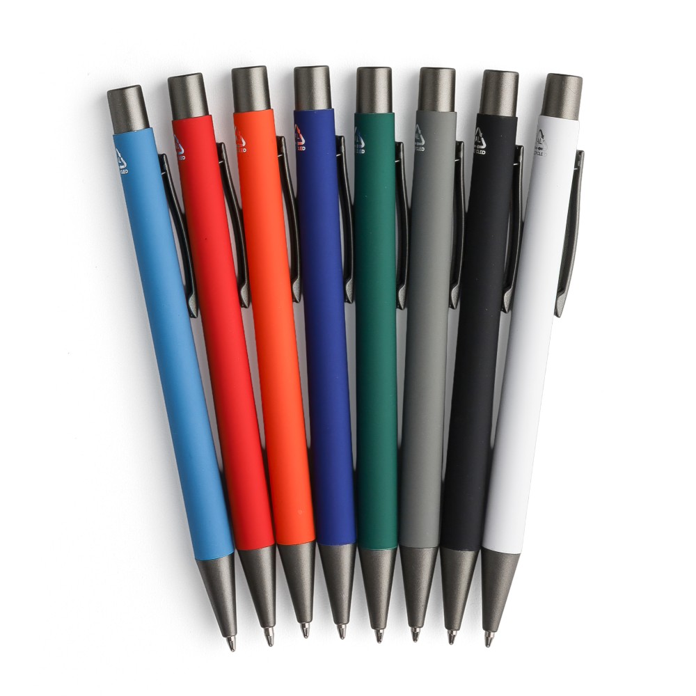 Újrahasznosított alumínium golyóstoll lágy tapintású gumírozott felülettel és kék tollbetéttel. Sötétszürke kiegészítőkkel és a bevonat alatti tükörhatású réteggel tervezve a látványos gravírozási eredmény érdekében. Nyomógombos szerkezettel és gravírozott újrahasznosított logóval.