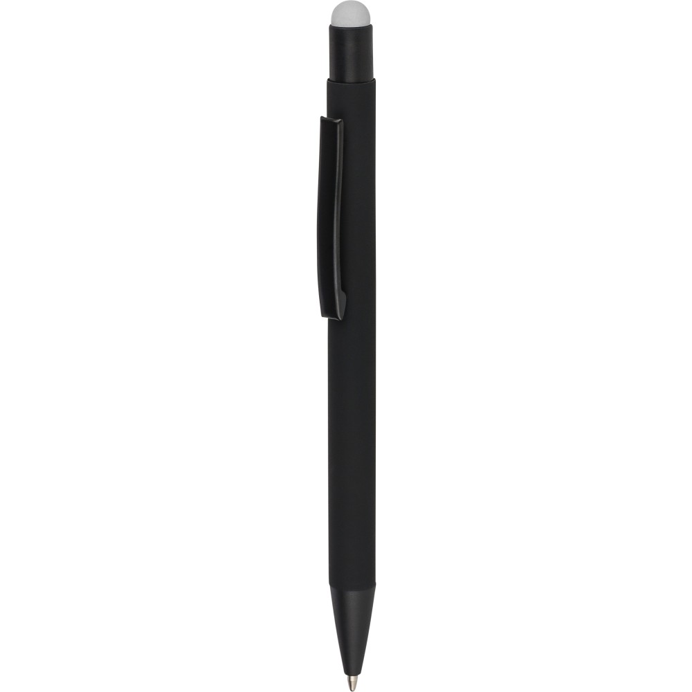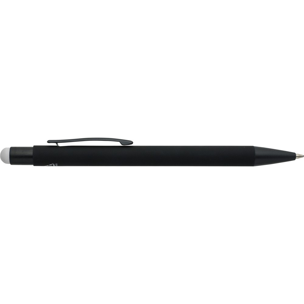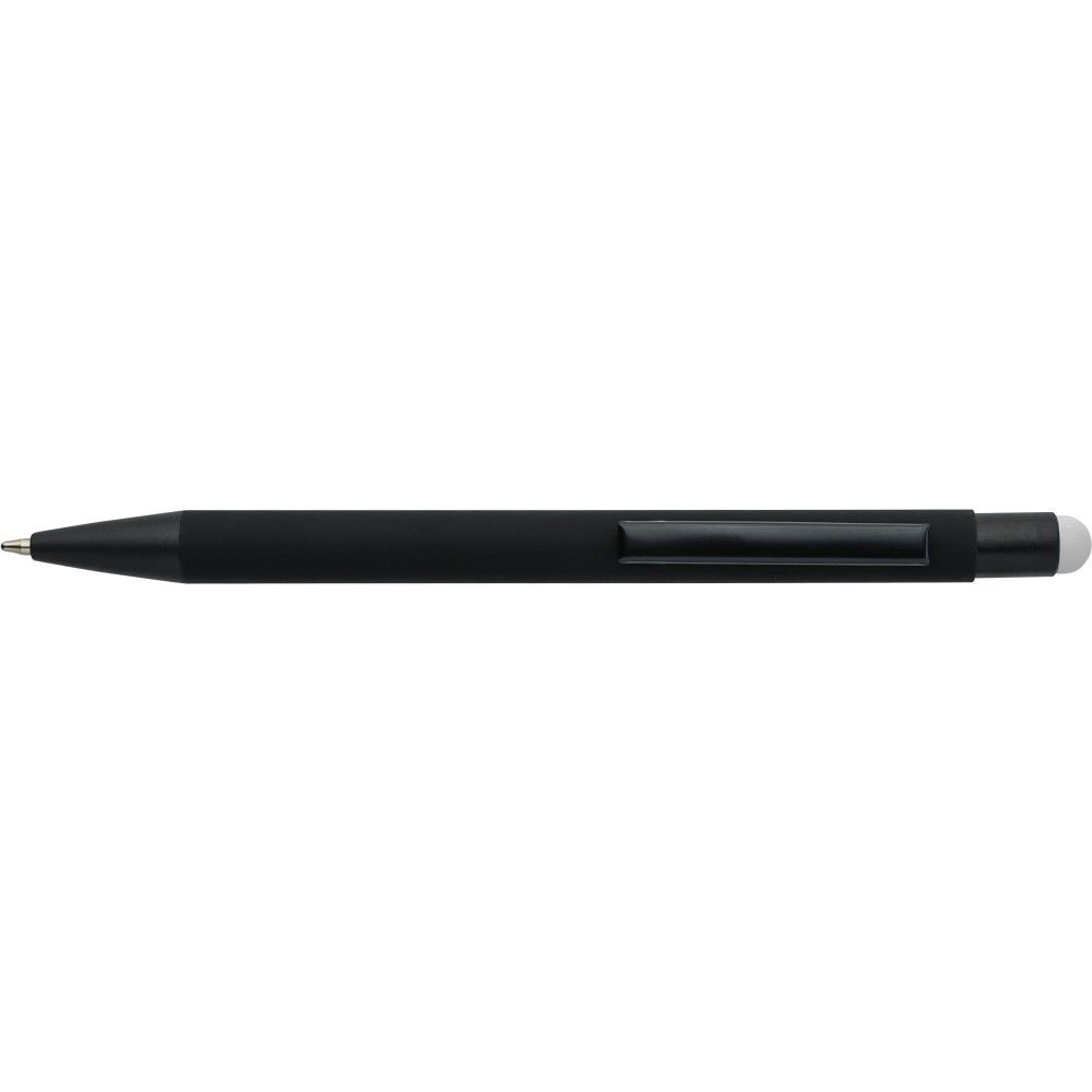 Újrahasznosított alumínium golyóstoll fekete, gumírozott felülettel és kék tollbetéttel. Színben illeszkedő kiegészítőkkel ? beleértve a belső tolltestet és az érintőképernyőkhöz használható stylus véget ?, amelyek kifinomult kontrasztot alkotnak gravírozáskor. Nyomógombos szerkezettel és gravírozott újrahasznosított logóval.