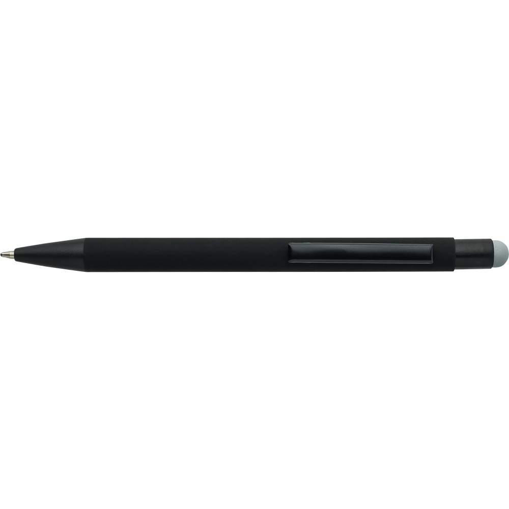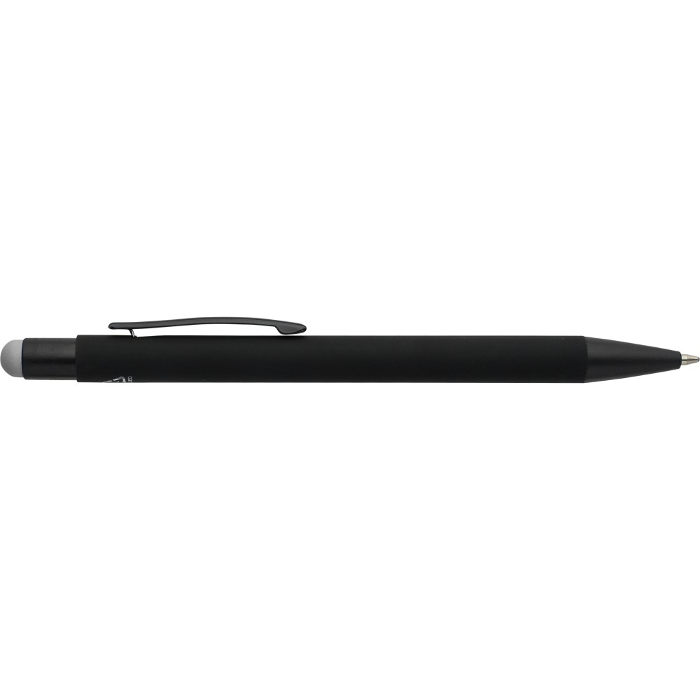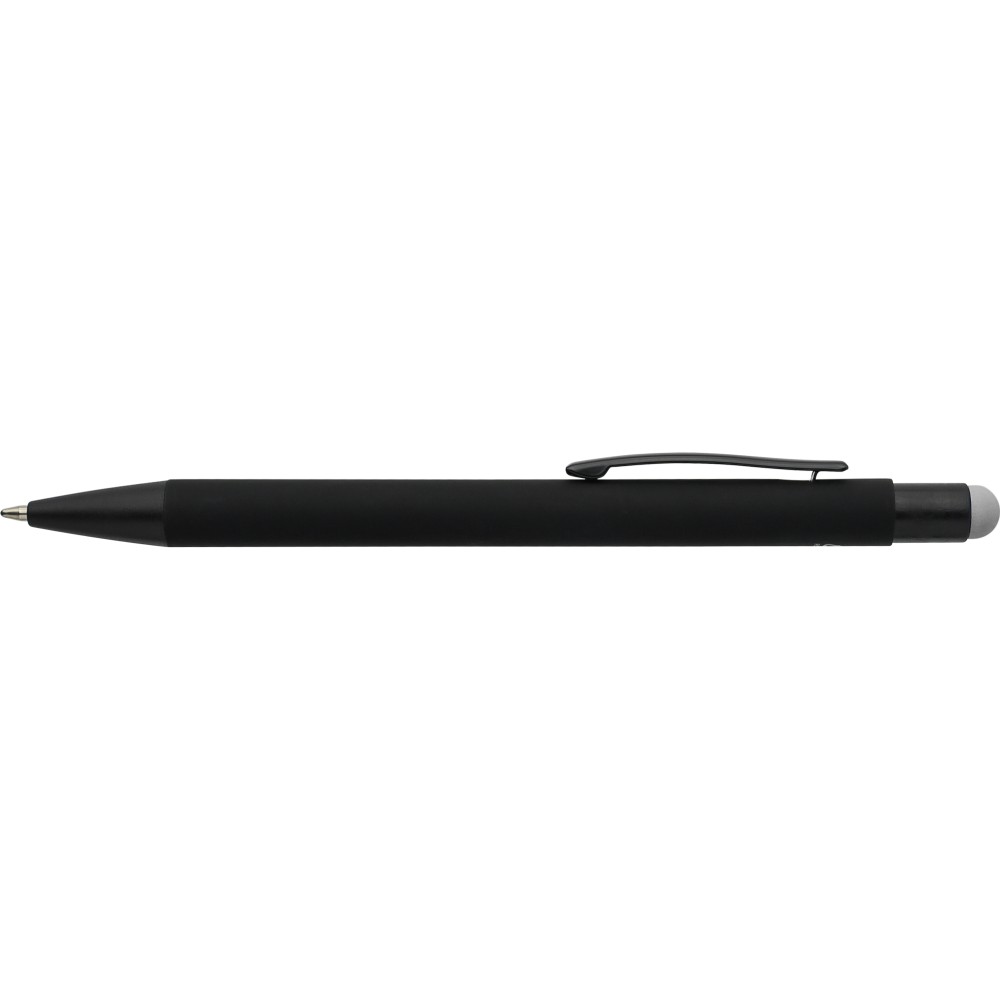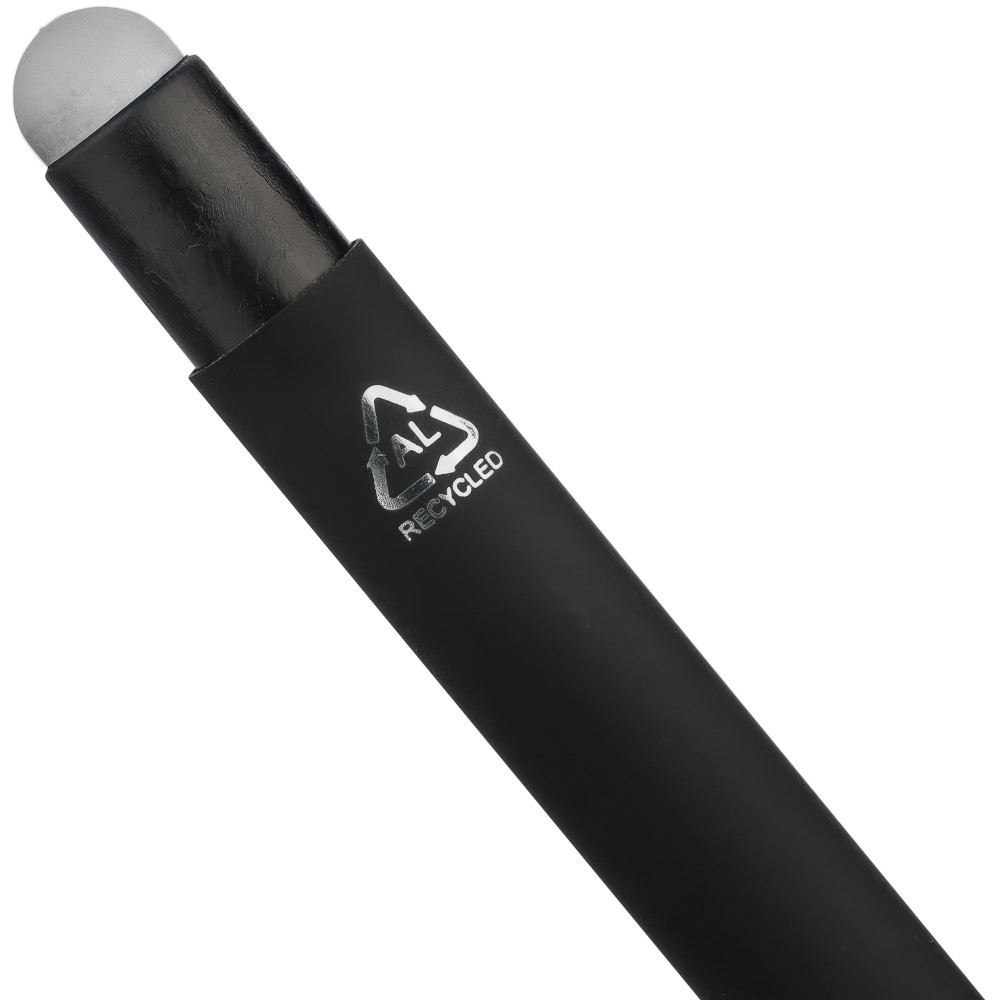 Újrahasznosított alumínium golyóstoll fekete, gumírozott felülettel és kék tollbetéttel. Színben illeszkedő kiegészítőkkel ? beleértve a belső tolltestet és az érintőképernyőkhöz használható stylus véget ?, amelyek kifinomult kontrasztot alkotnak gravírozáskor. Nyomógombos szerkezettel és gravírozott újrahasznosított logóval.
