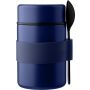 Rozsdamentes acél, duplafalú ételtartó (460 ml) fekete PP kanállal és a tartó színével megegyező szilikon markolattal, belső része 304-es, külső része 201-es rozsdamentes acél, PP fedéllel kerül szállításra, darabonként barna kartondobozba csomagolva. Emblémázás: Gravírozás, Tamponnyomás