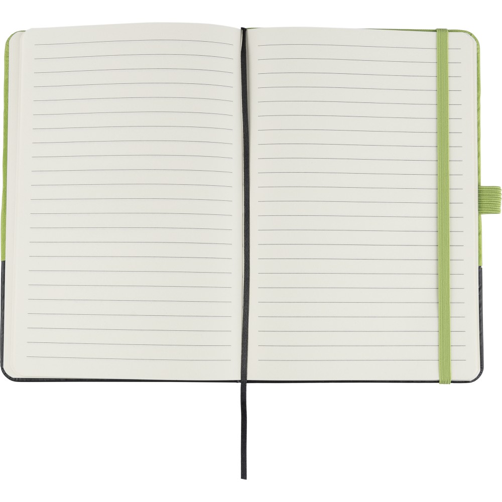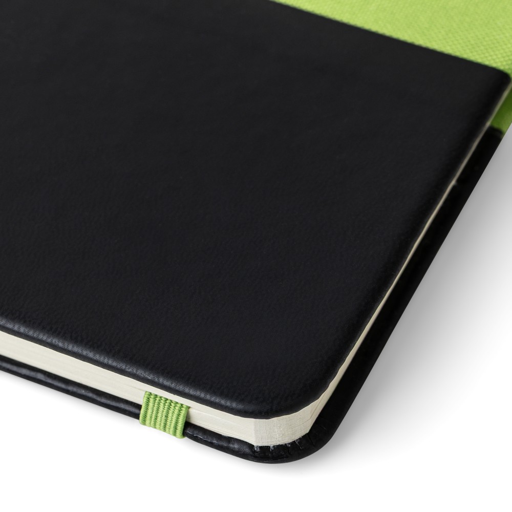 RPET poliészterből készült A5-ös jegyzetfüzet részben lézergravírozható PU előrésszel, amely gravírozás után a borító rPET anyagának színével egyező árnyalatot mutat. 80 lap 70 g/m2 vonalas papírt tartalmaz, gumipánttal, tolltartó hurokkal és könyvjelző szalaggal. Az alsó PU rész gravírozásra kialakítva, amely a megfelelő színt fedi fel. Emblémázás: Szitanyomás