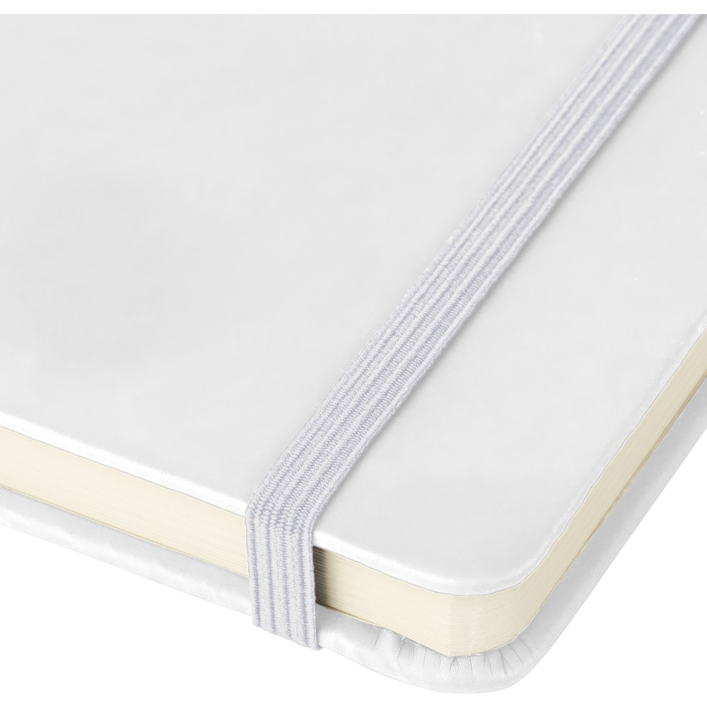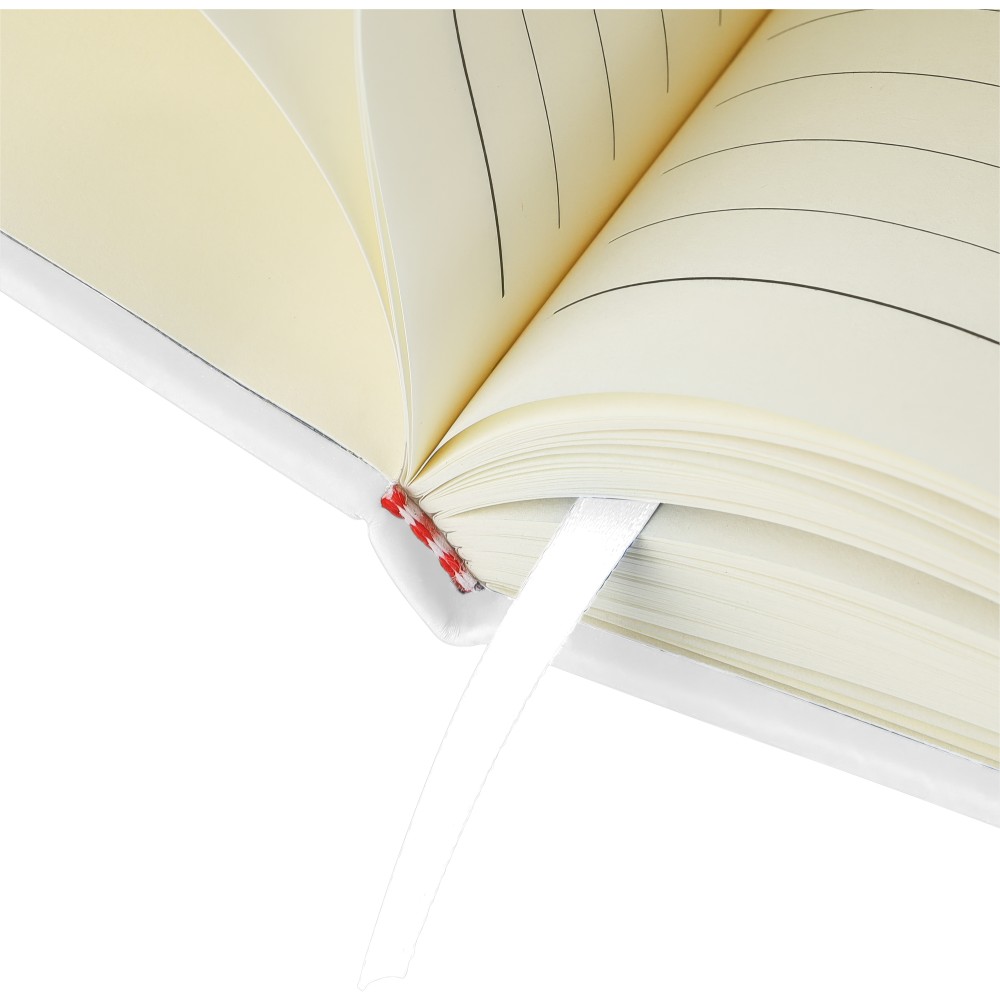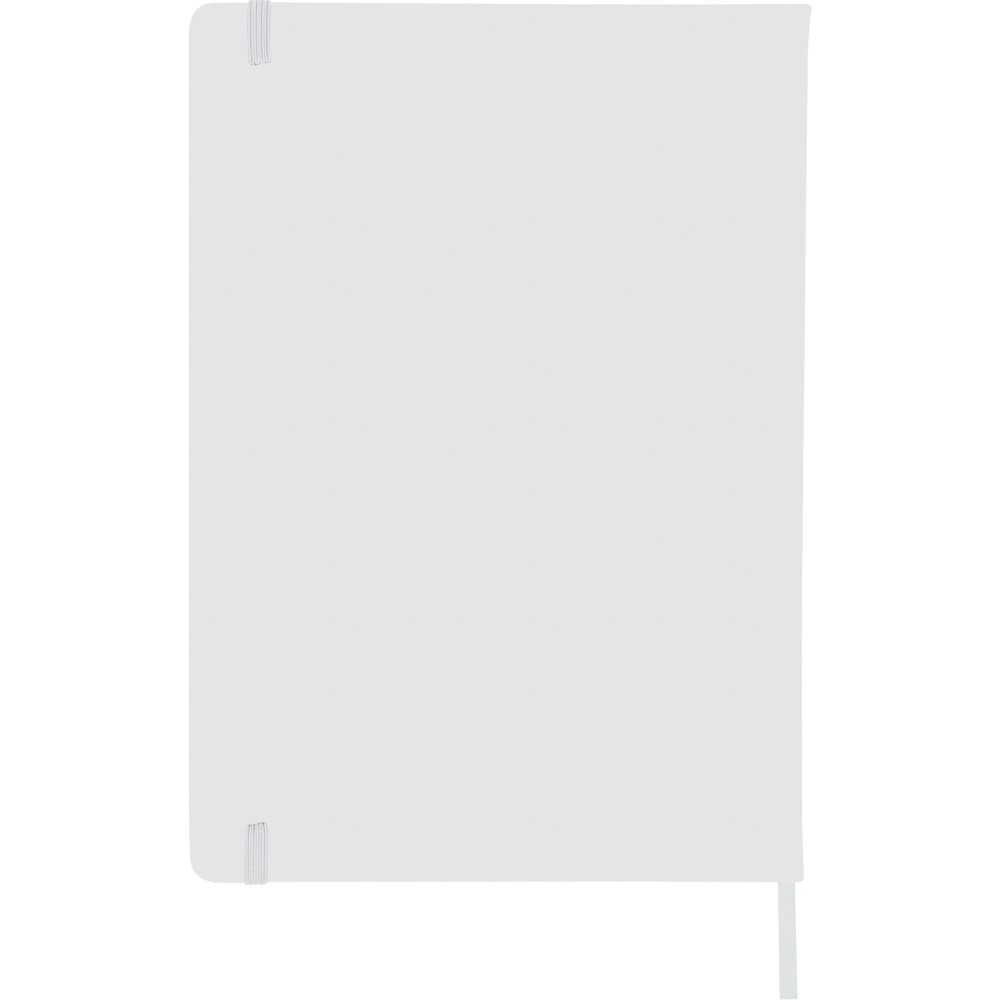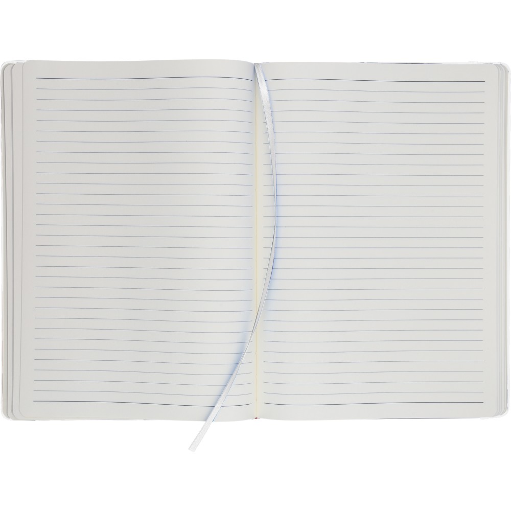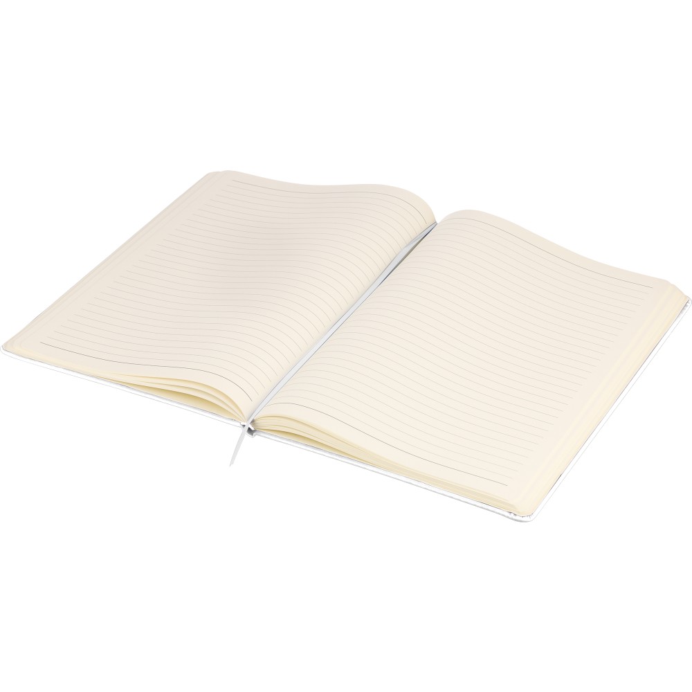 A4-es jegyzetfüzet élénk színű, újrahasznosított anyagból (PU) készült kemény borítóval. 96 db kétoldalas, vonalas lapot tartalmaz (6 g/m2), 0,7 cm-es vonalközzel, az elején és a végén két-két üres oldallal. A füzetben használt papír FSC Mix tanúsítvánnyal rendelkezik. Színben illeszkedő gumírozott rögzítőpánttal, beépített könyvjelző szalaggal és a hátoldalán dombornyomott újrahasznosított PU logóval ellátva.