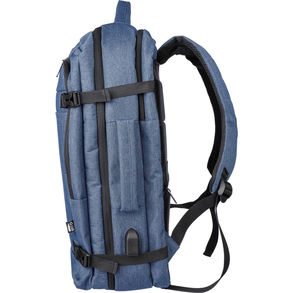 Hátizsák és laptoptáska 17 -es készülékhez. Kézipoggyász méretű. Hordozófüllel a tetején és oldalain. Tépőzáras laptop rekesszel, lopásgátló zsebbel és két nagy cipzáras rekesszel. Szellőző, párnázott hátoldallal, bőröndre húzható pánttal, zárócsatokkal és oldalsó USB-A porttal rendelkezik. Oldalsó csatok segítik a csomag kompakt tartását. Terhelhetősége kb. 12 kg. RPET alapanyagra utaló címke. Anyaga: 300D rPET poliészter. Emblémázás: Szitanyomás