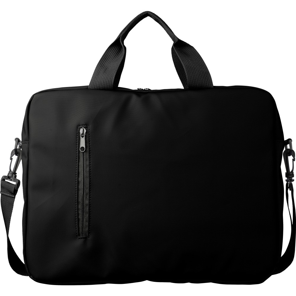 Laptoptáska 15"-es laptophoz PU anyagból, két cipzáras első zsebbel, egy nagy cipzáras rekesszel és tépőzáras laptop résszel, valamint több belső zsebbel. Állítható vállpántokkal és két fogantyúval rendelkezik. Vízlepergető. Anyaga: PU. Emblémázás: Szitanyomás