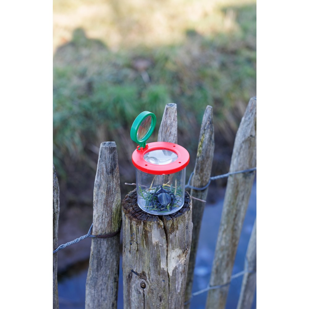 Rovarvizsgáló edény két beépített nagyítólencsével, amelyek 3-szoros és 6-szoros nagyítást tesznek lehetővé. ABS műanyagból készült. Közeli megfigyeléshez tervezték, ideális rovarok vagy apró tárgyak vizsgálatához. Gyermekek számára is alkalmas. Egyenként barna kartondobozba csomagolva.