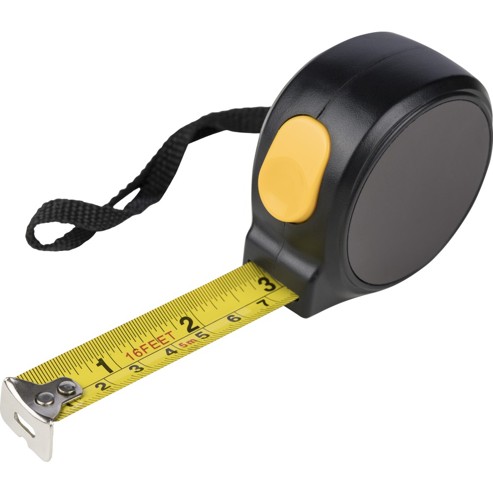 ABS műanyagból készült mérőszalag mágneses oldallal, 5 m hosszúságú és 19 mm szélességű fém szalaggal, centiméter- és inch-beosztással. Felül elhelyezett nyomógomb a rögzítéshez/kioldáshoz, valamint poliészter csuklópánt. Egyenként csomagolva illusztrációval ellátott barna kartondobozban.