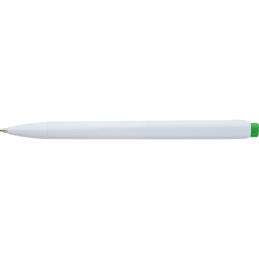 Golyóstoll tömör fehér tolltesttel és színes nyomógombbal. Újrahasznosított ABS-ből készült. Nyomógombos szerkezettel, klipsszel, valamint a nyomógomb tetején újrahasznosított ABS logóval rendelkezik. Kék színű, német Dokumental tollbetéttel, mely körülbelül 800 méter íráshosszt biztosít.