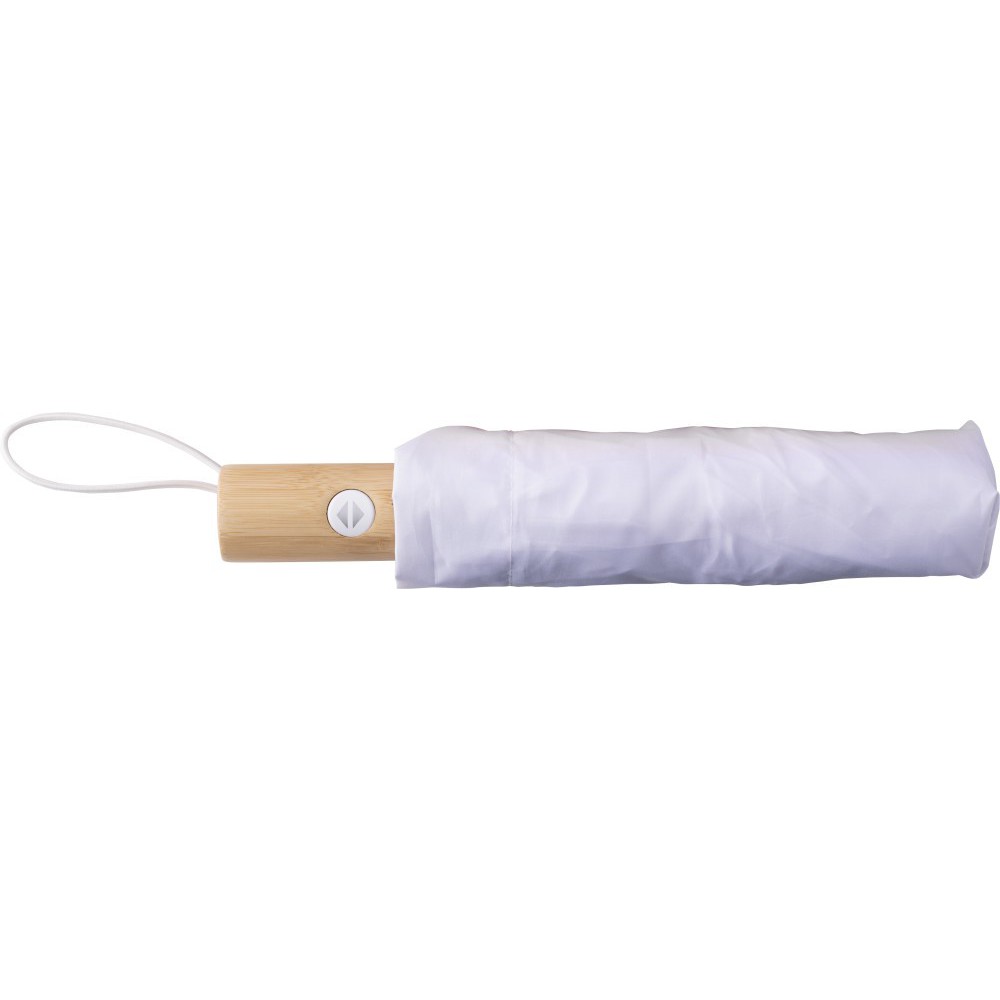 RPET összecsukható esernyő nyolc panellel, tépőzárral és bambusz fogantyúval, tokkal. Automatikus nyitó- és záró gombbal. Zárt méret: 29 cm. Emblémázás: Szitanyomás, Tamponnyomás
