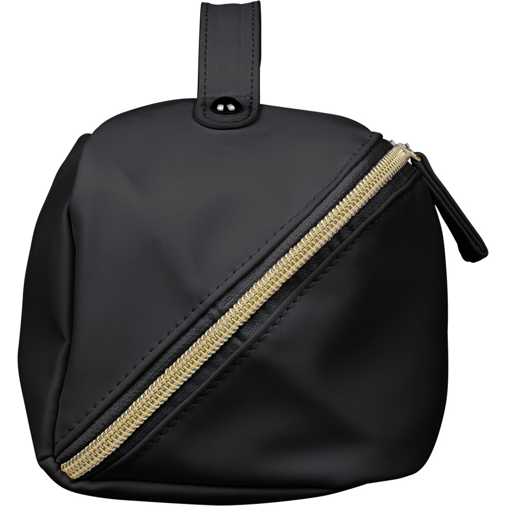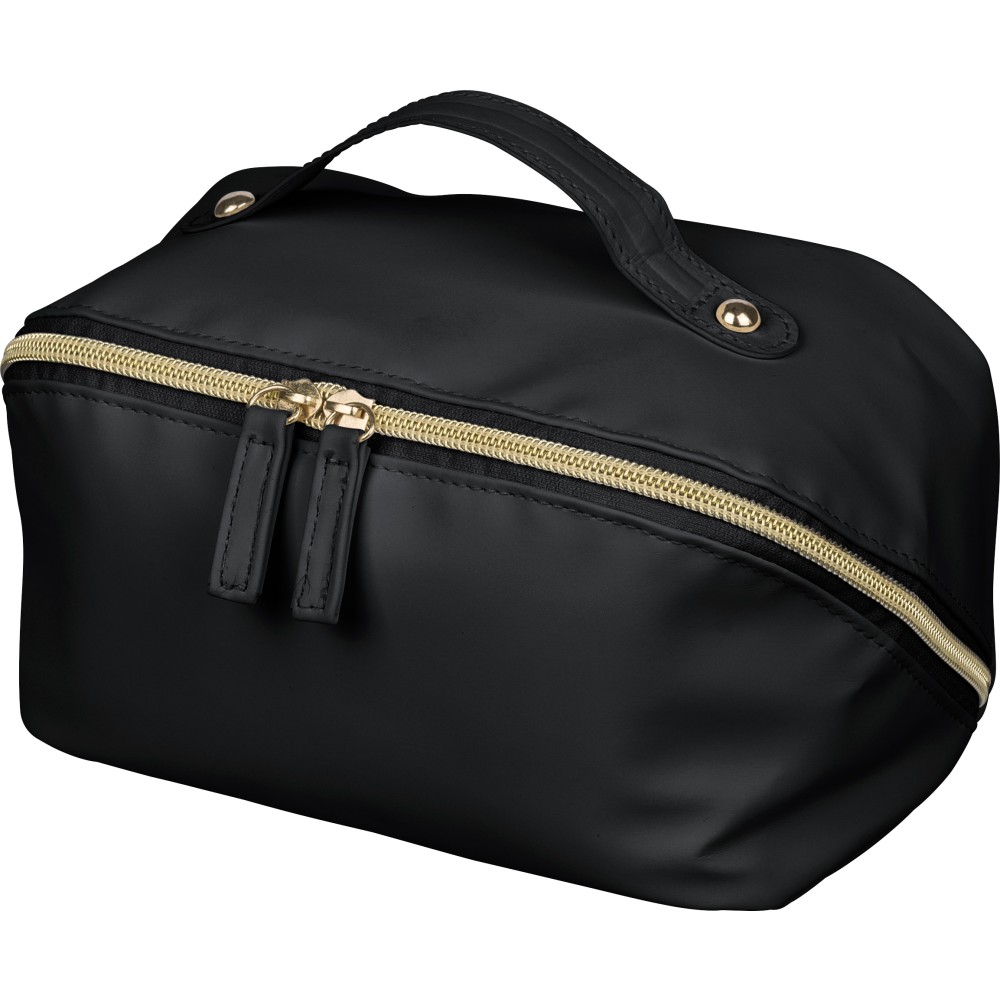 Újrahasznosított PU anyagból készült neszesszer középen elhelyezett cipzárral a széles nyithatóság érdekében. Rövid fogantyúval, tágas belső térrel és négy rekesszel, beleértve egy belső cipzáras zsebet. 210D újrahasznosított béléssel készült, belsejében egy újrahasznosított alapanyagra utaló címkével. Emblémázás: Szitanyomás