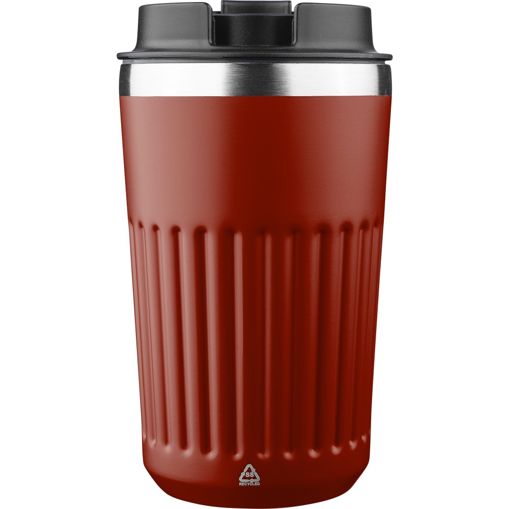Újrahasznosított rozsdamentes acélból készült utazópohár 400 ml űrtartalommal, duplafalú kialakítással és külső bordázott felülettel. Belső része 304-es, külső része 201-es rozsdamentes acél, PP fedéllel. A pohártesten gravírozott recycled (újrahasznosított) alapanyagra utaló logó található. Darabonként barna kartondobozba csomagolva. Emblémázás: Gravírozás, Tamponnyomás