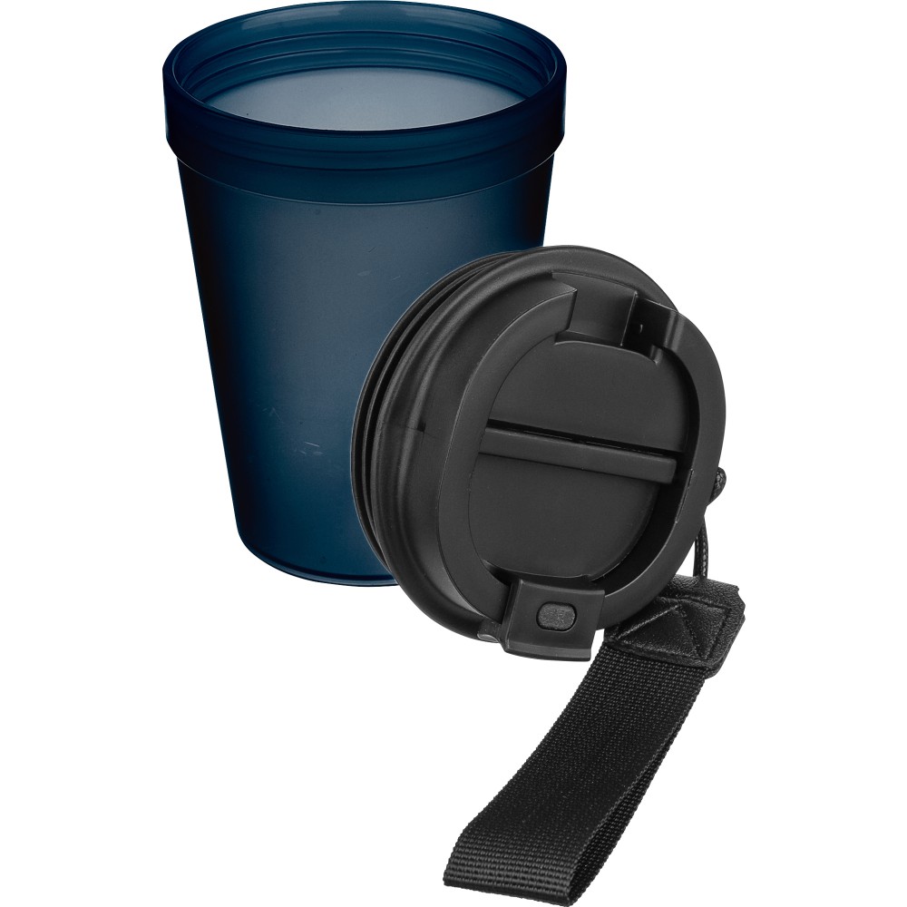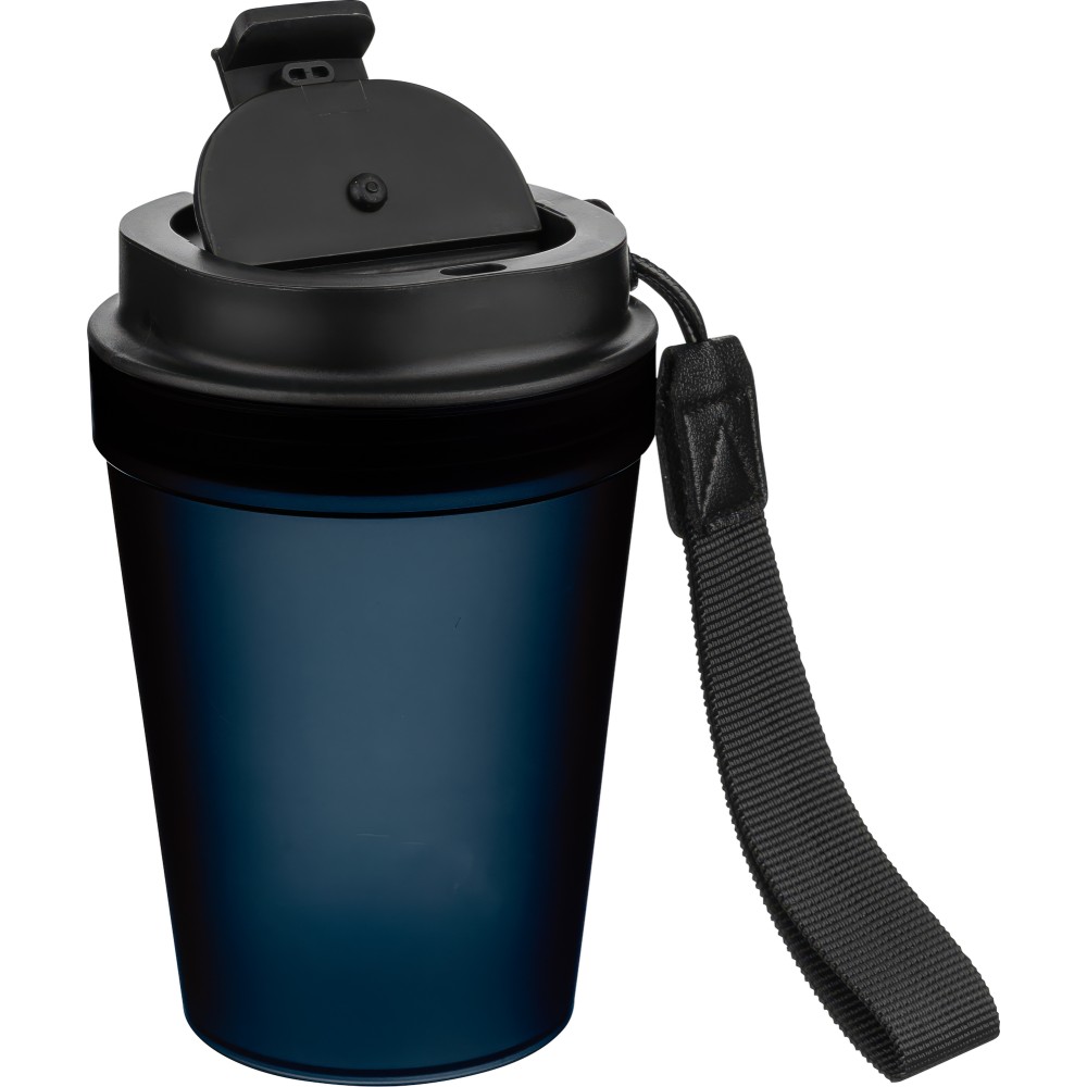 Átlátszó, szimplafalú ivópohár 350 ml-es űrtartalommal, vastagfalú kialakítással. Csavaros fedéllel és poliészter csuklópánttal rendelkezik a könnyű hordozhatóság érdekében. Tartós, ütésálló, megbízható termék. Meleg italokhoz is alkalmas, de kérjük, vegye figyelembe, hogy az egyfalú szerkezet miatt hőátadás előfordulhat.