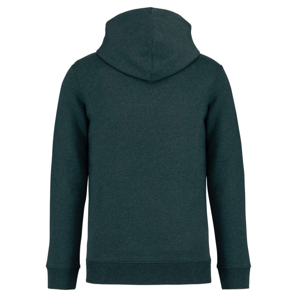 85 % bio, fésült pamutból és 15 % újrahasznosított poliészterből készült. Unisex. Egyenes szabás. Méretcímke organikus pamut és újrahasznosított poliészter logóval. LSF (Low Shrinkage Fleece: előzsugorított polár) kezelés. Kapucni. 1x1 bordás szegély és kézelő. Duplatűzés a kézelőn, a szegélyen és a nyaknál. Szalagozott nyakbelső hátul. Bélelt kapucni, a nyaknyíláson nincs felülvarrás, csak egy megkötés, hogy a húzózsinór a felső részen maradjon. Kerek húzózsinór a kapucnin fém véggel. Kenguru zseb. Nincs márkajelzés a nyakrészen, csak egy méretcímke a könnyű dekorálás érdekében. Karton függőcímkével érkezik, amely felsorolja a termék előállításához felhasznált környezetbarát anyagokat. Organikus pamutfonal. OEKO-TEX N CQ1007/7 STANDARD 100 tanúsítvánnyal rendelkezik. IFTH. 350 g/m2. Emblémázás: Hímzés, Szitanyomás