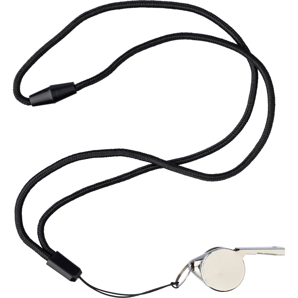 Síp poliészter zsinórral és műanyag biztonsági csattal. Egyenként barna kartondobozba csomagolva. Anyaga: fém. Emblémázás: Gravírozás