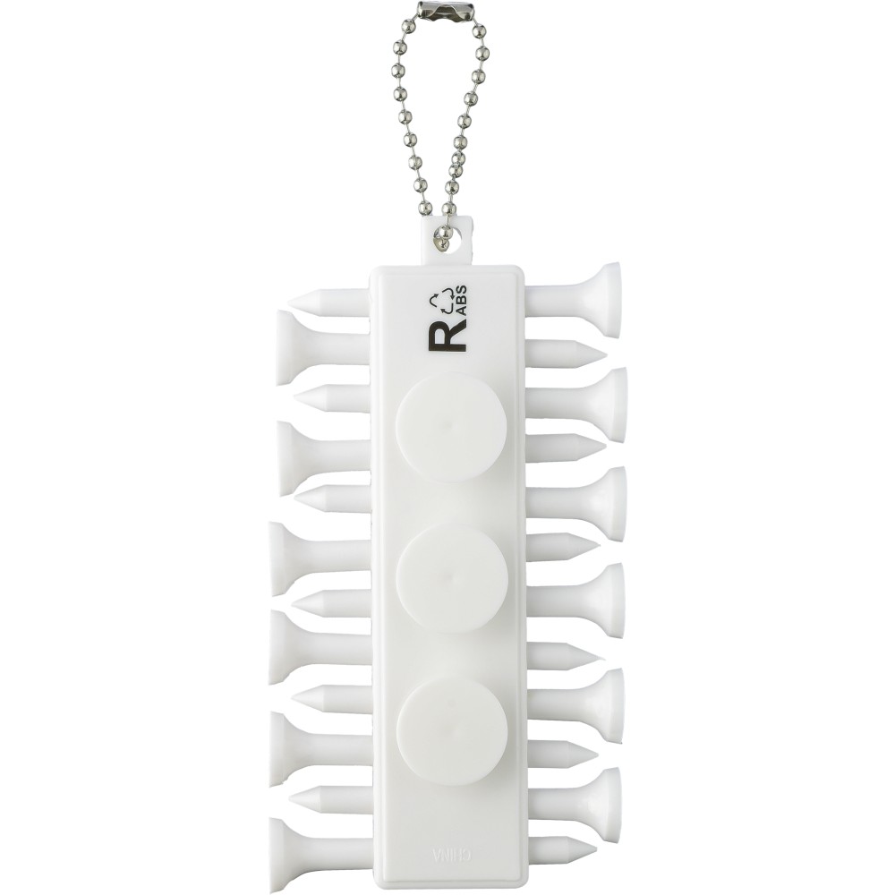 Újrahasznosított ABS goltee-készlet, amely 12 tee-ből áll, kompakt tartóban, hátulján három jelölővel. Fémzsinórral a könnyű rögzítés érdekében, hátulján pedig újrahasznosított ABS logóval. Emblémázás: Tamponnyomás