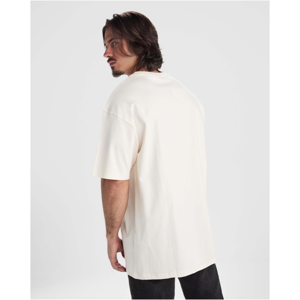 Túlméretes rövidujjú póló. Kerek nyak, 2x1 bordával szegve, színazonos varrással. Oldalsó varrások. Széles dupla varrás a ujjakon és az alján. Eltávolítható címke.
