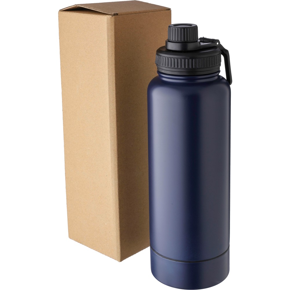 Duplafalú palack. Csavaros adagolóval és hordozóhurokkal ellátott PP fedéllel rendelkezik. Az alján egy kis csavaros rekesz található a tároláshoz. Belseje 304 rozsdamentes acélból, külseje pedig 201 rozsdamentes acélból készült. Egyenként barna kartondobozba csomagolva. Űrtartalom: 1 L. Emblémázás: Gravírozás