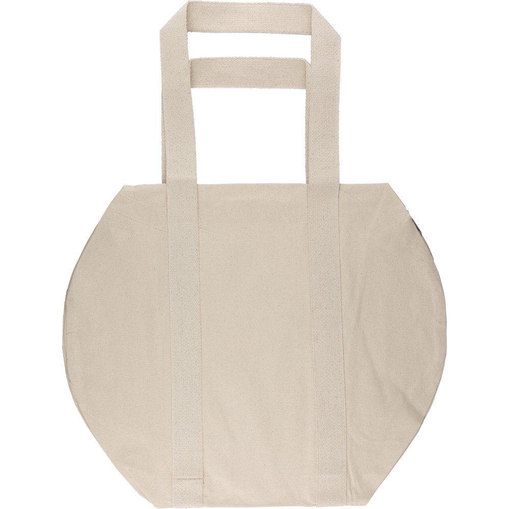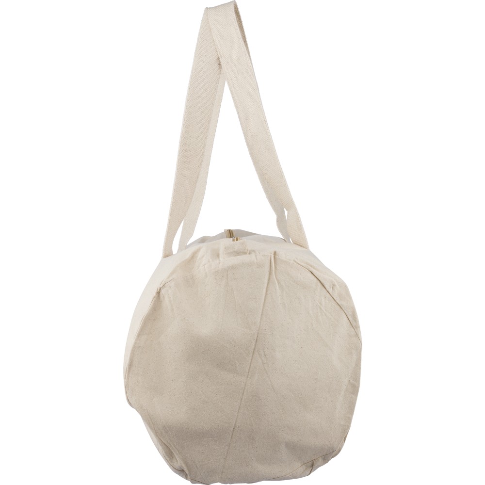 Oeko-Tex minősítésű, 180 g/m2 pamutból készült natúr színű, cipzáras sporttáska 60 cm hosszúságú és 5 cm szélességű pamutfülekkel. Oeko-Tex címkével ellátva.