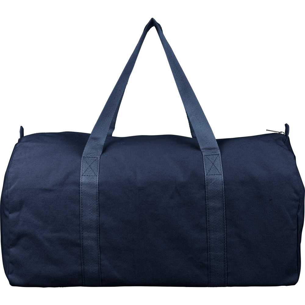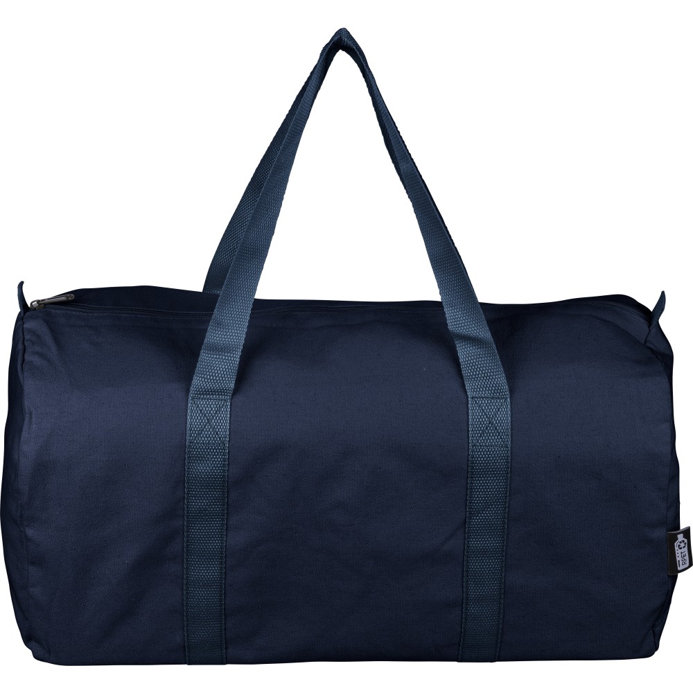 Újrahasznosított pamut-poliészter, 330 g/m2 kevertszövetből készült sporttáska nagy, cipzáras felső rekesszel, 100 cm hosszúságú és 3 cm szélességű hosszú fülekkel, a táska színével megegyező hevederrel. Megközelítőleg 30 literes űrtartalommal rendelkezik. A külső felületen rPET címkével, a belső részben újrahasznosított alapanyagra utaló címkével ellátva. Emblémázás: Szitanyomás