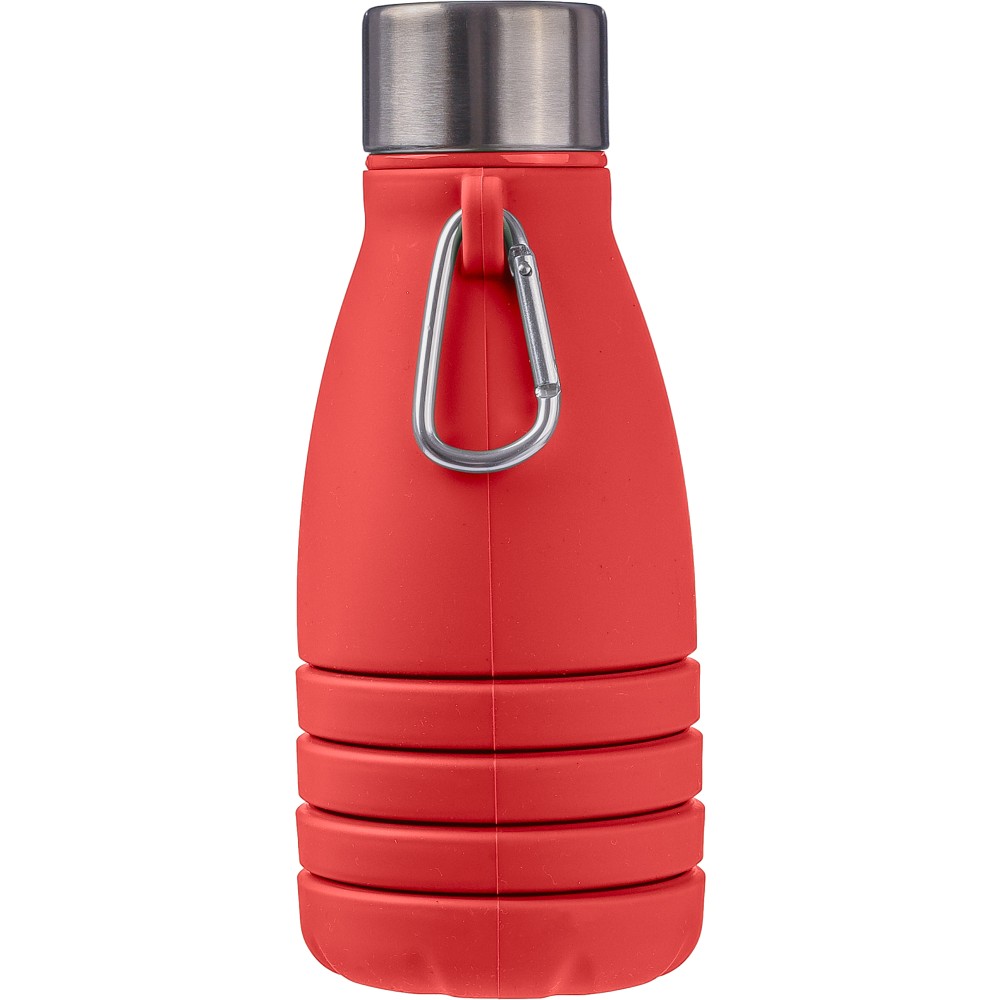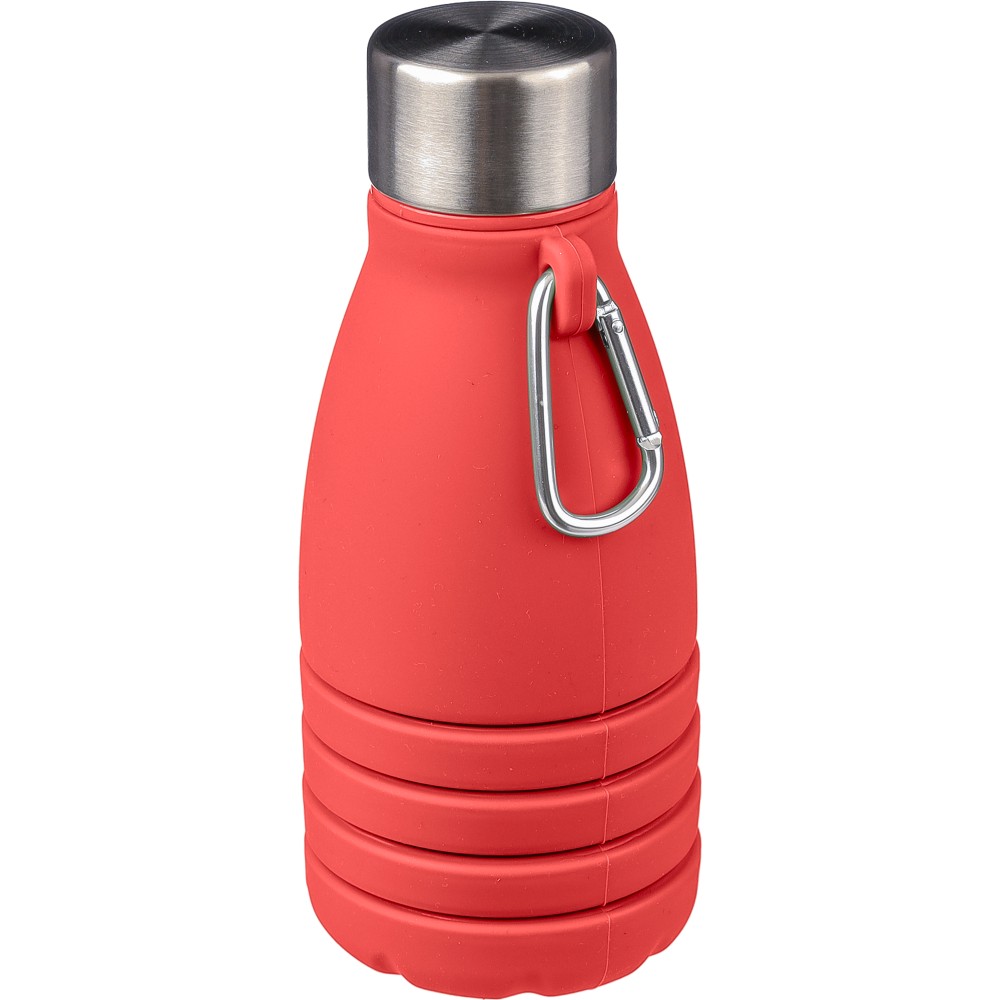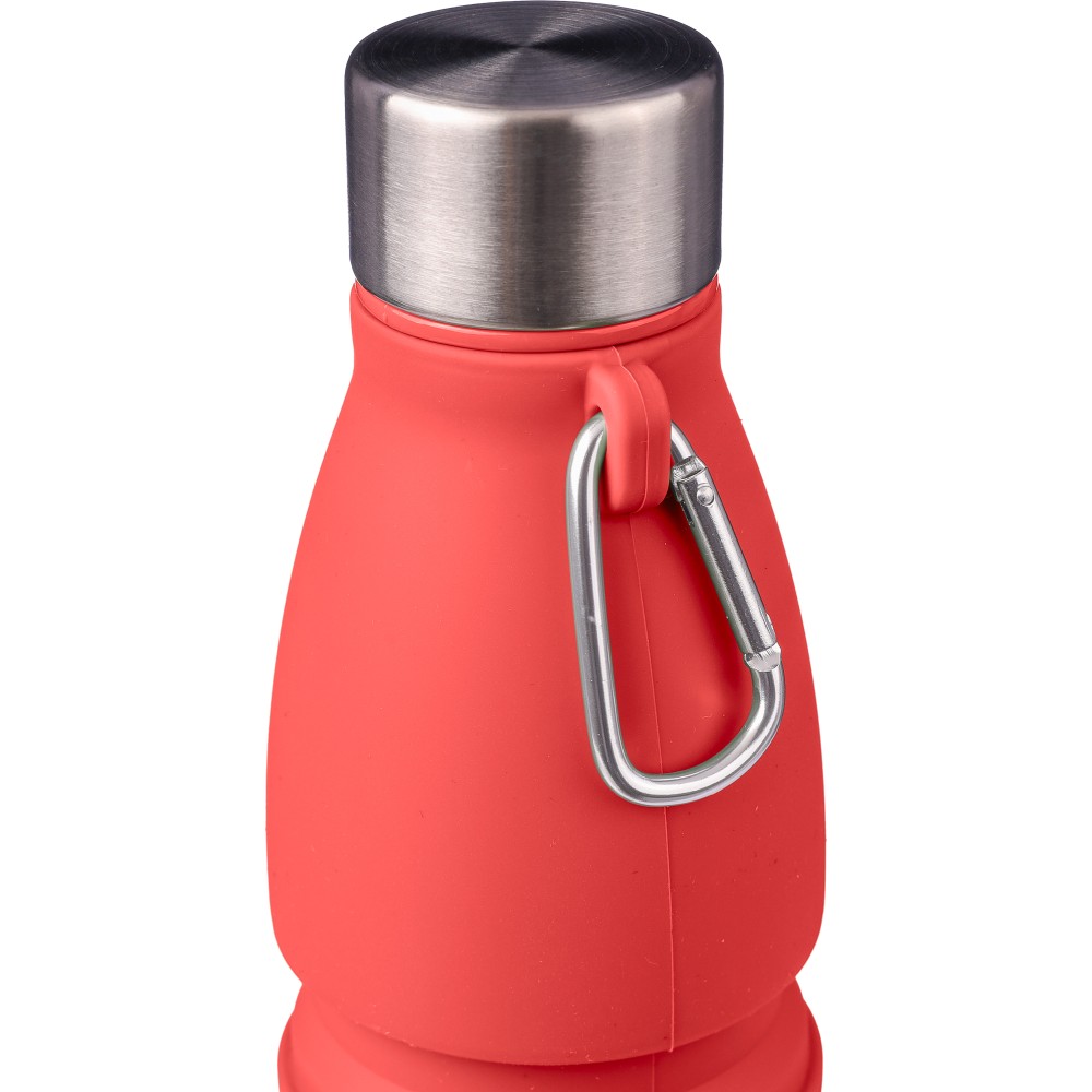 Összecsukható palack rozsdamentes acél fedéllel és alumínium karabinerrel. Összecsukott méret: d: 7x17 cm, kinyitott méret: d: 7x25 cm. Nincs egyenként csomagolva. Anyaga: szilikon. Űrtartalom: 550 ml. Emblémázás: Gravírozás