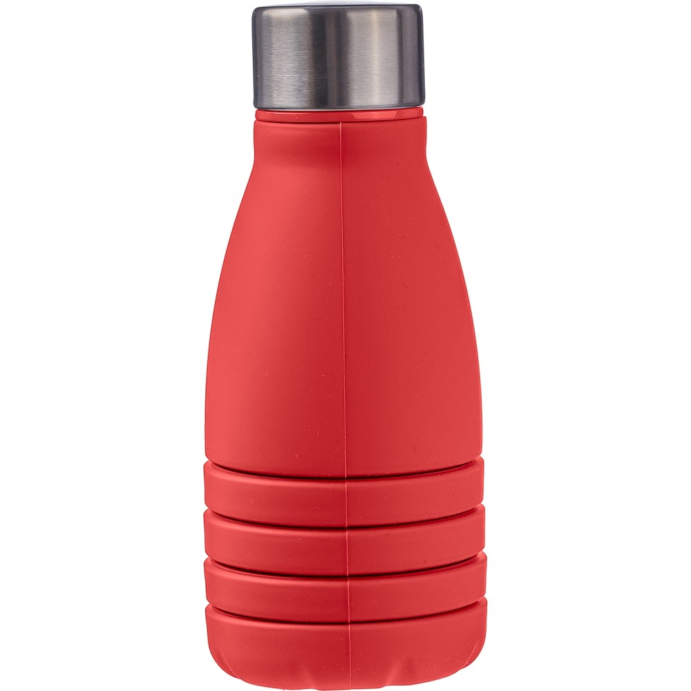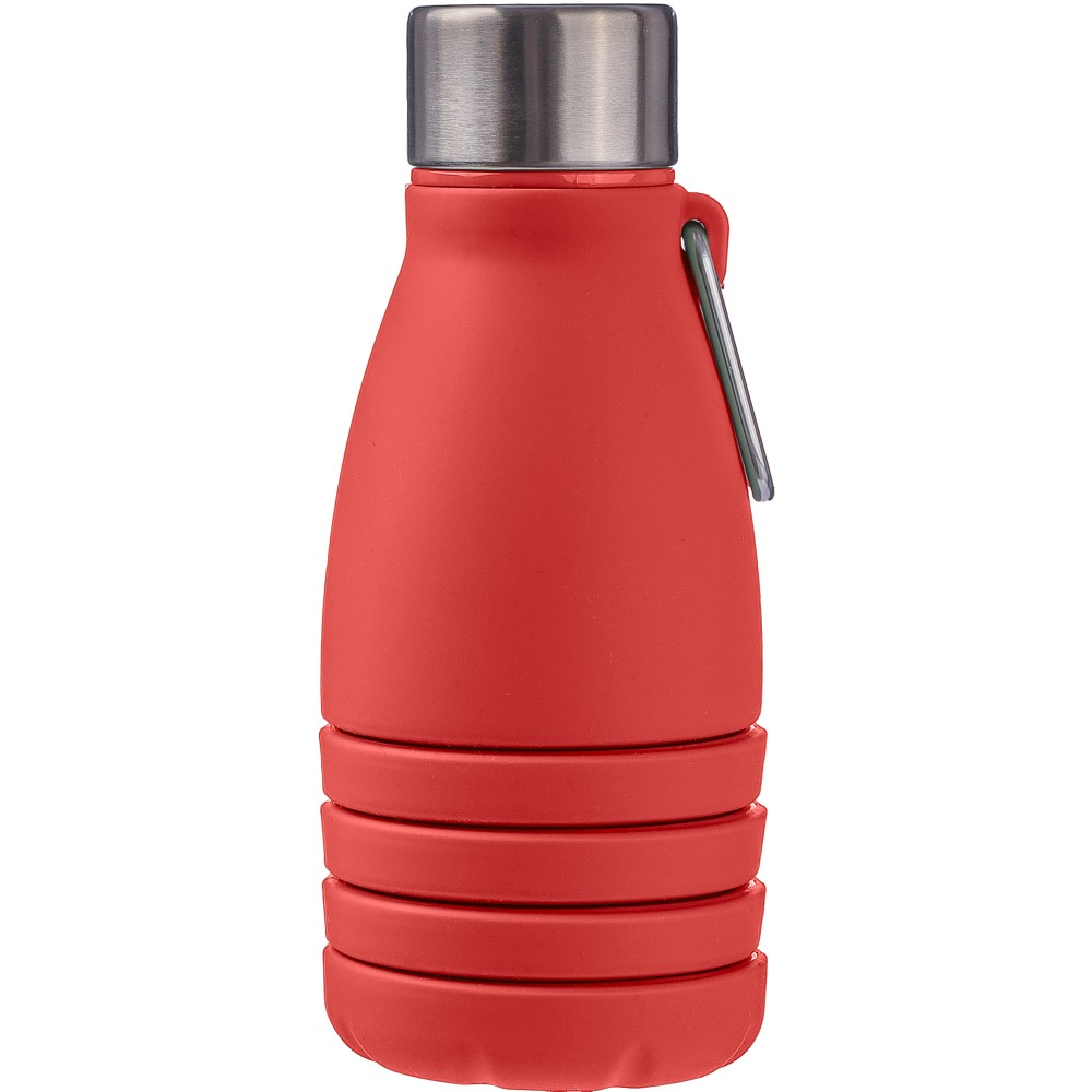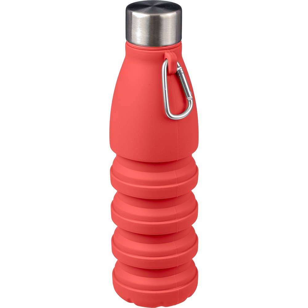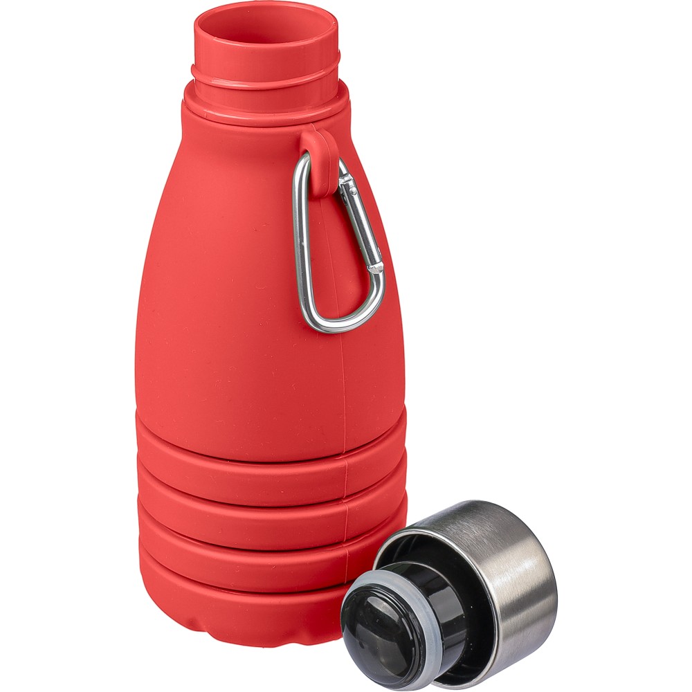 Összecsukható palack rozsdamentes acél fedéllel és alumínium karabinerrel. Összecsukott méret: d: 7x17 cm, kinyitott méret: d: 7x25 cm. Nincs egyenként csomagolva. Anyaga: szilikon. Űrtartalom: 550 ml. Emblémázás: Gravírozás