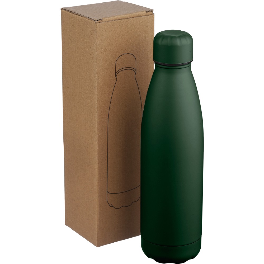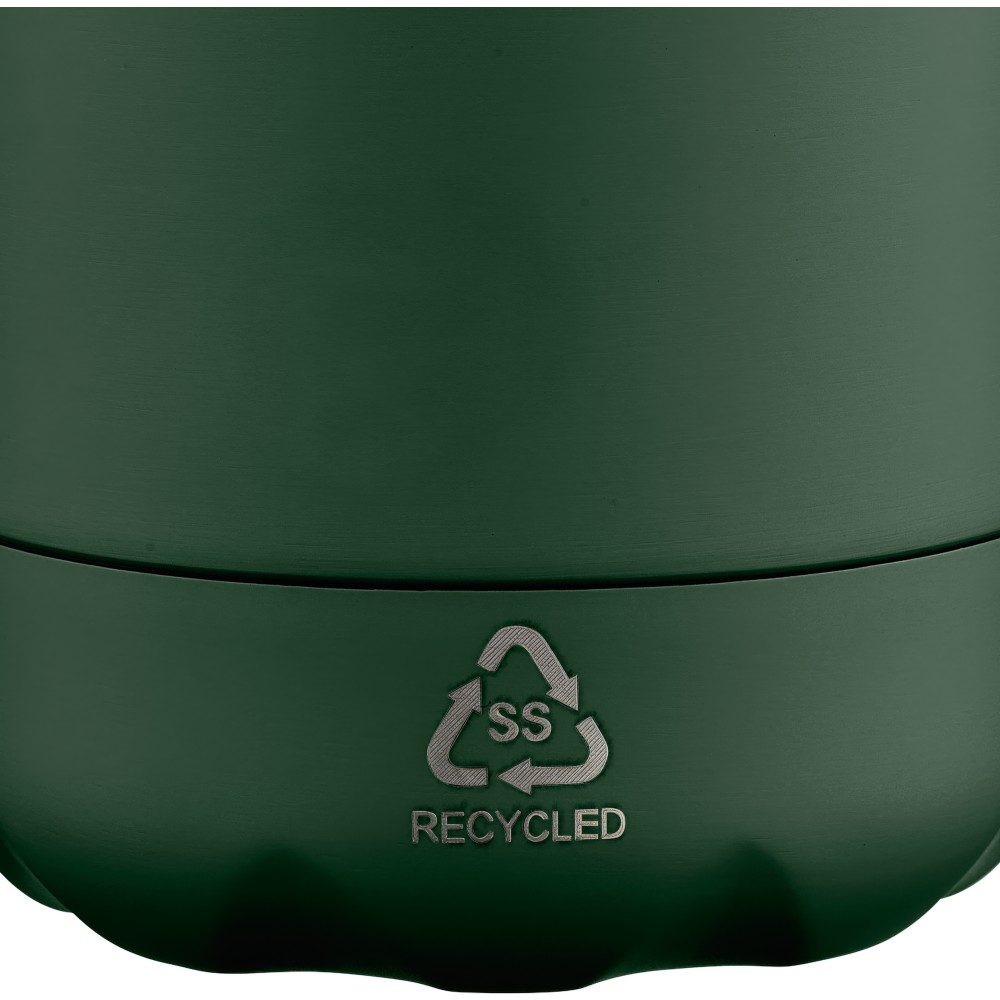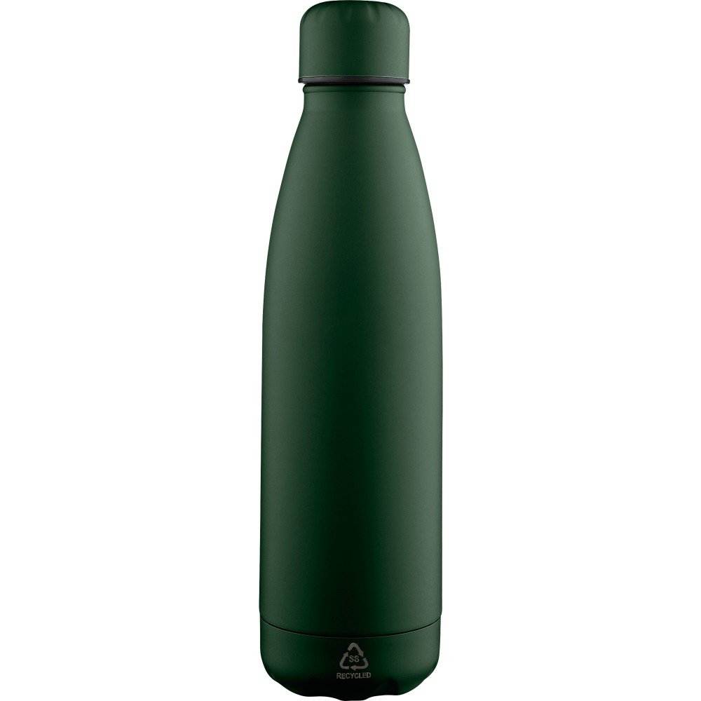Újrahasznosított rozsdamentes acél, egyfalú ivópalack 700 ml-es űrtartalommal. Hideg italok tárolására alkalmas, és 3-4 órán át hűvösen tartja azokat. A 304-es rozsdamentes acél belső kiváló tartósságot, rozsdaállóságot és biztonságos élelmiszer-érintkezést garantál. Matt színű felülettel, valamint színben illeszkedő csavaros fedéllel és aljjal. Az elülső oldalon gravírozott újrahasznosított logó található. Egyenként barna kartondobozba csomagolva.